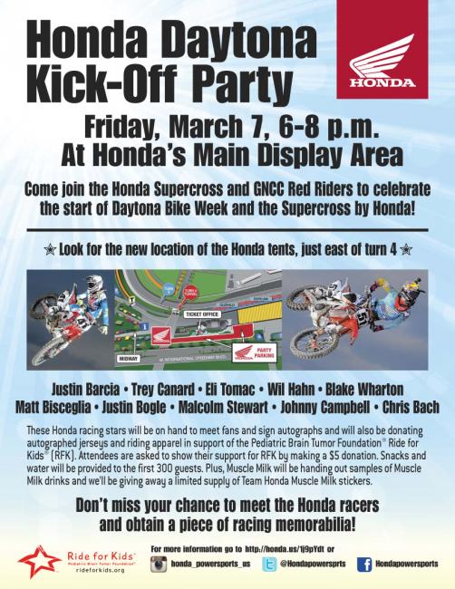 Be sure to come join the Honda Supercross and GNCC Red Riders to celebrate the start of Daytona Bike Week and the Supercross by Honda on Friday, March 7, 6-8 p.m., at Honda’s Main Display Area (look for the new location of the Honda tents, just east of turn 4).
