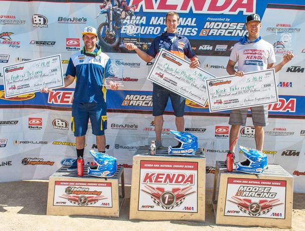 Charlie Mullins' perfect win streak helped set the stage for a perfect podium at Round 4 of the Kenda National Enduro Series held at Park Hills, Missouri. Nick Fahringer and Andrew DeLong completed the trifecta with 2nd and 3rd place finishes. With over 500 entries the Motorcycle Superstore Bell Helmet support riders had their hands full, but by the end of the race they captured seven of the top ten spots.
