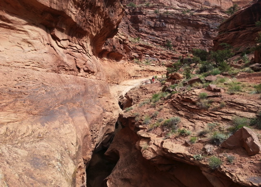 We were on a slower pace this day, but that just meant the terrain was more technical. We headed into the Kane Creek trail, and I can only compare the area to what Wile E. Coyote & the Road Runner played in – mountains of rocks and drop offs up to 600 feet. Now if you can picture the stuff you can barely climb up without ropes, that is what we were riding down, around and up on bikes. We got to see the trails where Jeeps and UTVs go rock crawling. (Some of these trails were the ones Anthony and Alex rode in the UTVs.)