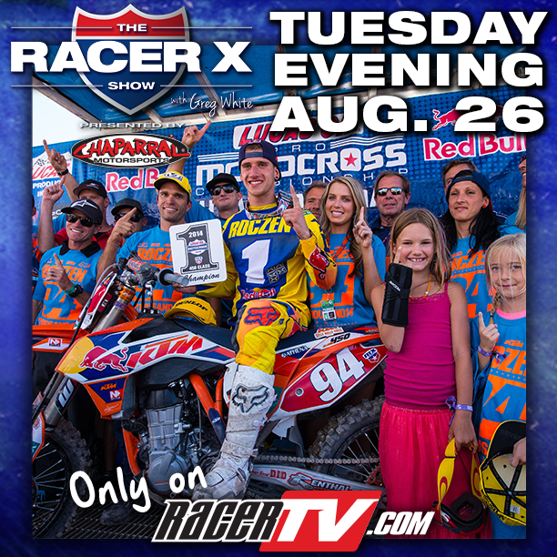 This week on The Racer X Show with Greg White presented by Chaparral Motorsports, we have Lucas Oil Pro Motocross highlights from Utah, AMA Pro Flat Track from Virginia and Endurocross from Georgia. Also, an exclusive interview with Pro Motocross 450 Class Champion Ken Roczen. We give you information on the Supercross/Motocross paddock, who is going where for 2015 and more.