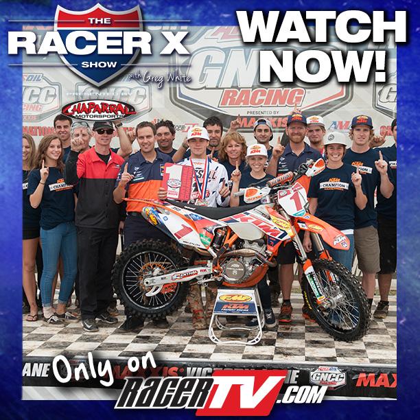 Tonight on The Racer X Show with Greg White presented by Chaparral Motorsports, we have AMSOIL GNCC Motorcycle highlights from Mountain Ridge where FMF/KTM's Kailub Russell clinched his second-straight GNCC National Championship! Andrew DeLong gets his first career title in the AMA National Enduro Series and we have highlights from the Muddobbers finale. Plus, AMA Superbike Champion Josh Hayes video chats with us about his fourth title in five years, and we get you up to speed on this weekend's Motocross of Nations US Team.