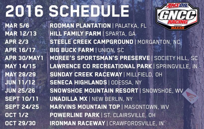 For those who may have missed the announcement last week, the 2016 GNCC schedule has been finalized and posted! We’ve got a few changes in store for 2016, including 2 new rounds that promise to provide some really fun racing. We’ve also shifted around a couple of races, which should make the season even more fun as the simplest date changes can have a pretty big impact on a venue.