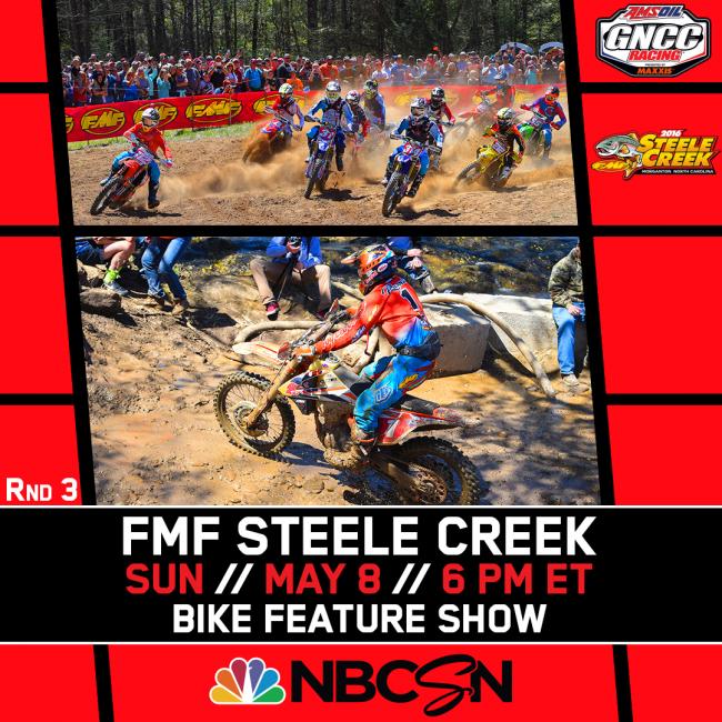 Don’t miss the GNCC Bike feature show on NBCSN this Sunday, May 8 at 6 p.m. ET from the FMF Steele Creek, Round 3 of the 2016 AMSOIL Grand National Cross Country Series presented by Maxxis.
