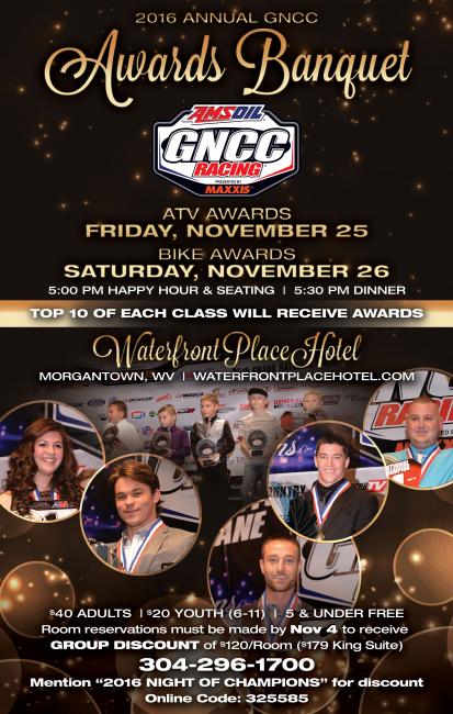With only two rounds remaining in the 2016 AMSOIL Grand National Cross Country (GNCC) Series presented by Maxxis, an AMA National Championship, Racer Productions is pleased to announce the annual GNCC banquet will be held on Friday, November 25, and Saturday, November 26. The Waterfront Place Hotel and Convention Center in Morgantown, West Virginia, will return to host this year’s banquet to recognize the world’s best off-road competitors.