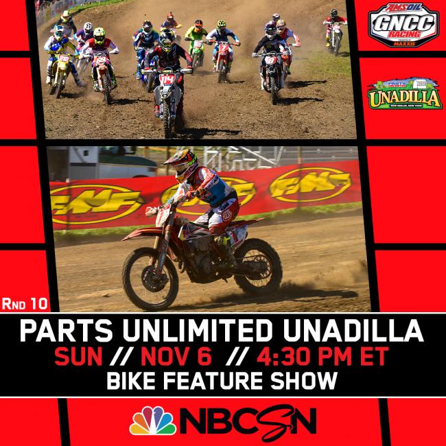 This Sunday, November 6 NBC Sports Network (NBCSN) will be broadcasting round 10, Parts Unlimited Unadilla GNCC Bike Feature show at 4:30 p.m. EST. The bike feature show will broadcast highlights from round 10, which takes place at the legendary Unadilla MX. Be sure to tune in or set your DVR’s to relive all the action from New Berlin, New York.