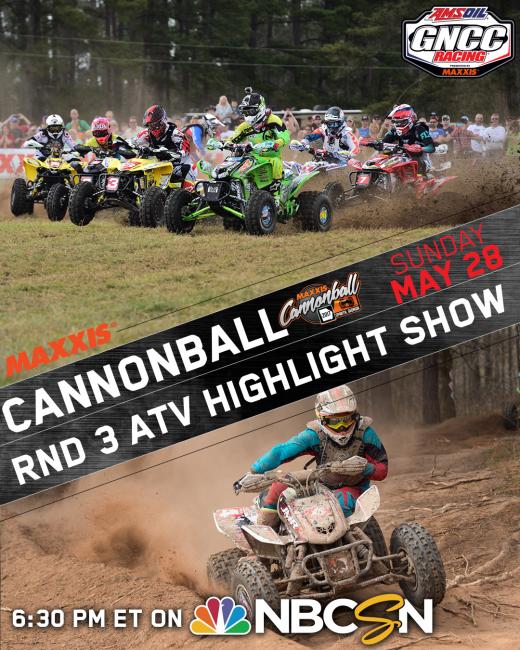 Don’t miss the GNCC ATV Highlight show on NBCSN Sunday, May 28 at 6:30 p.m. ET from the Maxxis Cannonball, Round 3 of the 2017 AMSOIL Grand National Cross Country Series presented by Maxxis.