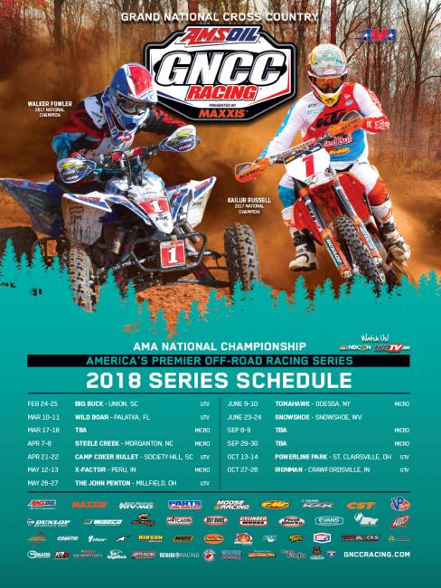 MORGANTOWN, W.Va. (December 1, 2017) – Racer Productions, producer of the AMSOIL Grand National Cross Country (GNCC) Series, an AMA National Championship, is pleased to announce the 2018 series schedule. The GNCC series will kick off with the Big Buck GNCC on February 24 and 25 in Union, South Carolina, then continue to with the traditional format with the Wild Boar GNCC in Palatka, Florida, held in conjunction with Daytona Beach’s 2018 “Bike Week” festivities on March 10 and 11.