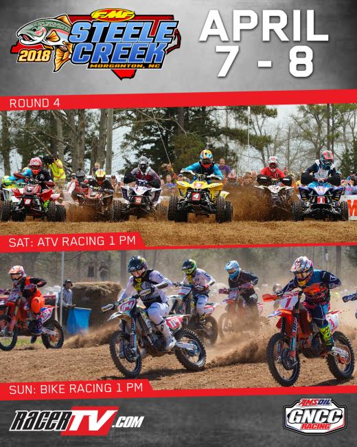 Tune in to RacerTV.com this weekend, April 7 and 8 at 1:00 p.m. ET/10:00 a.m. PT for the AMSOIL Grand National Cross Country (GNCC) Series, an AMA National Championship, round 4 – the FMF Steele Creek GNCC LIVE Broadcast from Morganton, North Carolina.