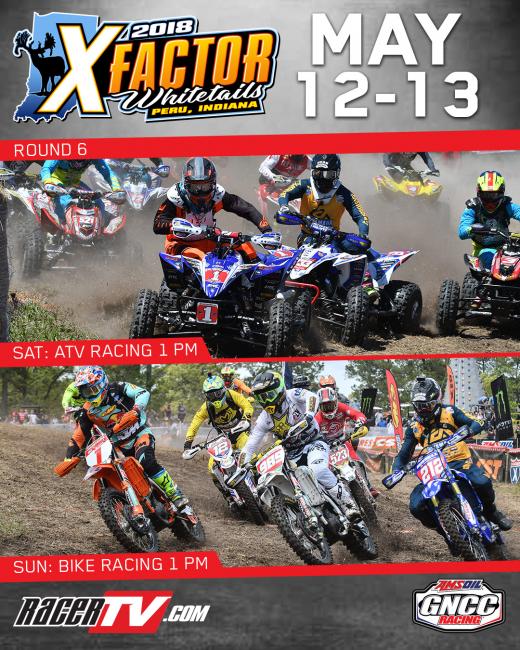 MORGANTOWN, W.Va. (May 11, 2018) – Tune in to RacerTV.com this Saturday, May 19 at 1:00 p.m. ET for pro ATV racing. Then Sunday, May 20 at 1:00 p.m. ET tune in for pro bike racing. The 2018 AMSOIL Grand National Cross Country (GNCC) Series, an AMA National Championship, heads into round 6 – the X-Factor Whitetails GNCC from Peru, Indiana.