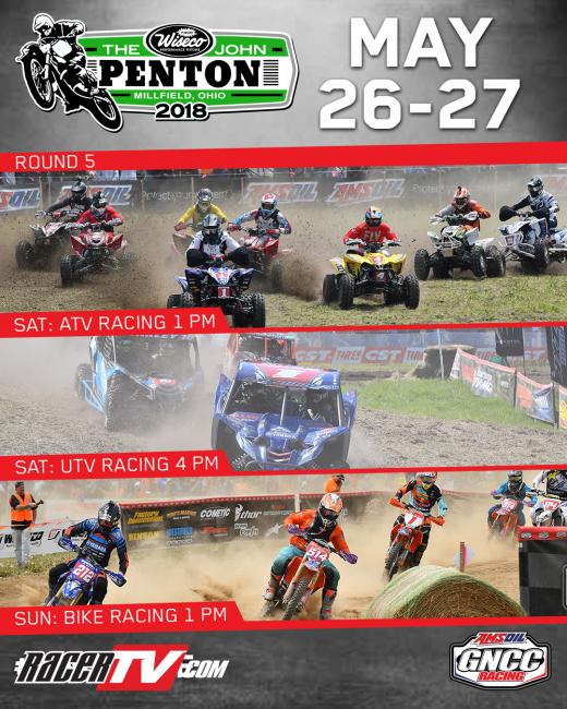 MORGANTOWN, W.Va. (May 25, 2018) – This weekend do not miss GNCC Live on RacerTV.com from the 2018 AMSOIL Grand National Cross Country (GNCC) Series, an AMA National Championship, round 7 – The Wiseco John Penton from Millfield, Ohio. The live broadcast starts Saturday, May 26 at 1 p.m. ET for pro ATV racing and 4 p.m. ET for pro UTV racing. Then Sunday, May 27 at 1 p.m. ET tune in for pro bike racing.