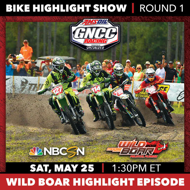 MORGANTOWN, W.Va. (May 24, 2019) – Tune in to NBC Sports Network (NBCSN) this Saturday, May 25, at 1:30 p.m. EST for the 2019 AMSOIL Grand National Cross Country (GNCC) Series presented by Specialized, an AMA National Championship, season opener – Moose Racing Wild Boar bike highlight show from Palatka, Florida.