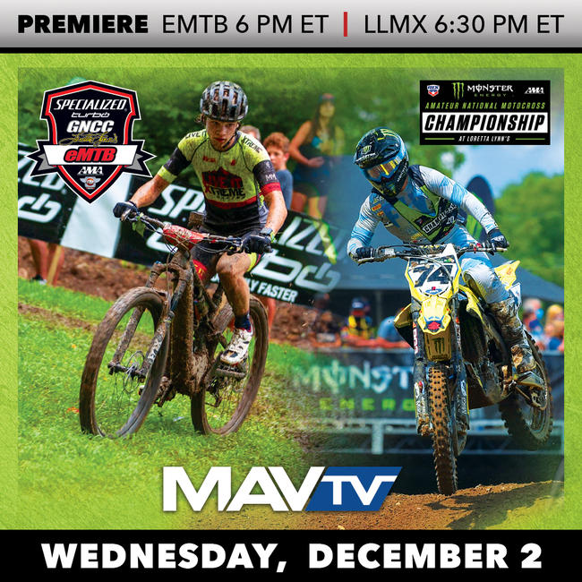 Tune-in and watch the Specialized Turbo eMTB GNCC racing action today from Loretta Lynn's Ranch in Hurricane Mills, Tennessee. Today MAVTV premiere's the Specialized Turbo GNCC Loretta Lynn's eMTB Race, first-ever FIM North American eMTB Championship at 6 pm ET followed by the first of three Monster Energy AMA Amateur National Motocross Championship episodes at 6:30 pm ET.