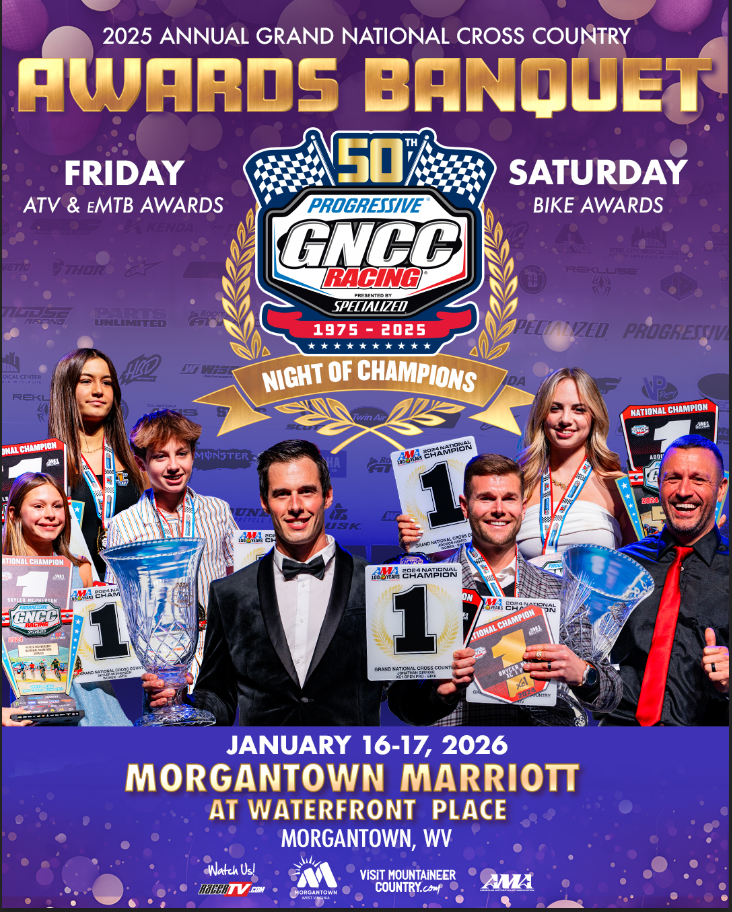Join us for the Progressive Grand National Cross Country (GNCC Racing) Series presented by Specialized, an AMA National Championship, Night of Champions Awards Banquet on Friday, January 16 and Saturday, January 17 at the Morgantown Marriott at Waterfront Place in Morgantown, West Virginia.